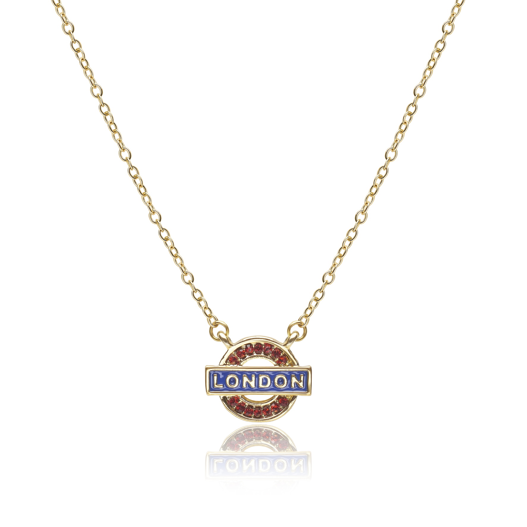 Bright, vivid pendant necklace shaped like an iconic London tube sign. This highly detailed pendant is instantly recognisable. The London underground Pendant sparkles with red stones and bright red and blue enamel detail to really make it stand out. A truly iconic piece to remember a visit to the famous city.