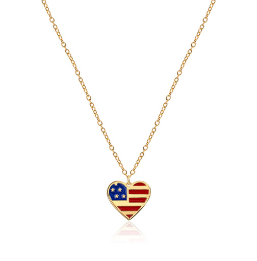 Heart shaped USA flag pendant, featuring 50 white stars on a blue canton with a field of 13 alternating stripes, 7 red and 6 white. The 50 stars represent the 50 states of the union and the 13 stripes stand for the original 13 states. The patriotic pendant is perfect all to appreciate. It is simple and stylish, and showcases an individuals personality. An ideal gift for anyone with a love for travel.